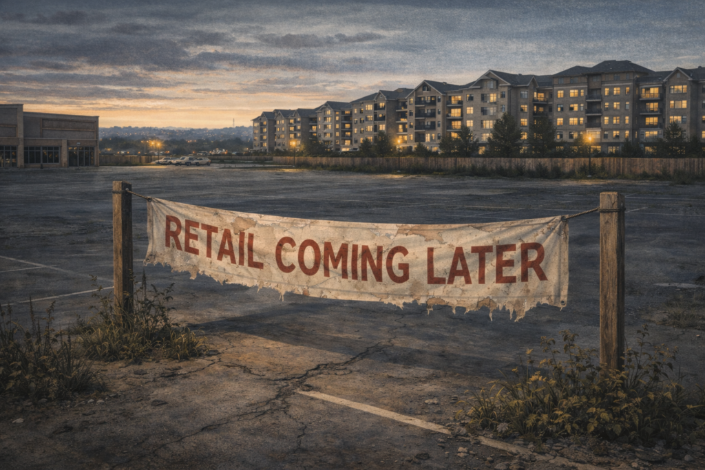 Reality: The market gets “ready” when fundamentals align. Retailers and employers care about visibility, traffic, access, household income, competition, land costs, permitting time, and whether the site actually functions. If those basics are off, you can add rooftops for a decade and still not land meaningful commercial.